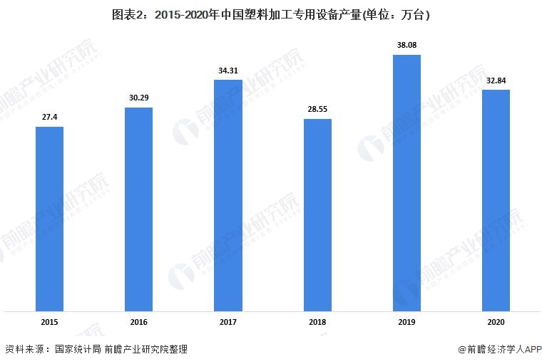 2020年,受塑料薄膜、泡沫塑料等塑料产品产量下降的影响,我国塑料加工专用设备产量也随着下降。2020年我国塑料加工专用设备产量32.84万台,同比下降19.17%。
