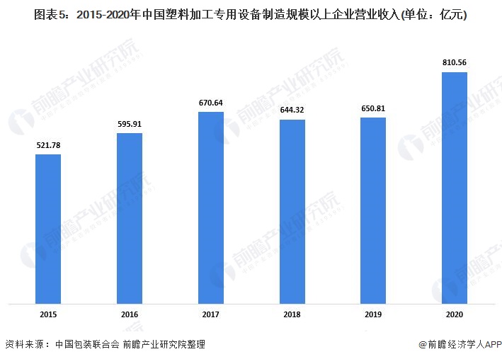 2020年中国塑料加工专用设备制造行业规模以上企业(年主营业务收入2000万元及以上全部工业法人企业)实现营业收入810.56亿元,同比增长21.05%。