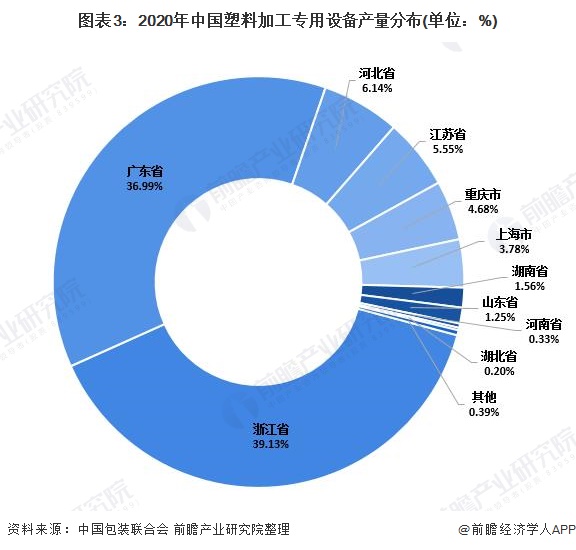 从塑料加工专用设备产量区域分布来看,2020年我国塑料加工设备产量排在前五位的地区依次是浙江省、广东省、河北省、江苏省和重庆市。其中,浙江省完成产量12.85万台,占比39.13%;广东省完成产量12.15万台,占比36.99%;河北省完成产量2.02万台,占比6.14%。