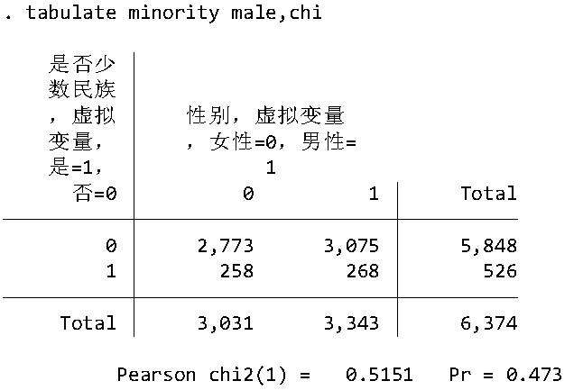 进行卡方分析,检验男性与女性中少数民族占比是否相等