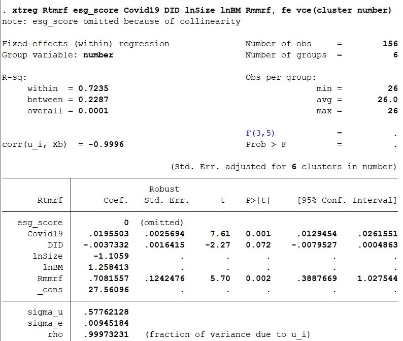 如图所示,我想要进行一个面板回归,用的是个体聚类,但是发现F值以及部分变量显著性检验的std、t和p都变成了一个点,但是我如果取消个体聚类就不会出现这种情况(虽然按道理应该加上个体聚类,而且核心did变量esg*covid19没有任何影响)