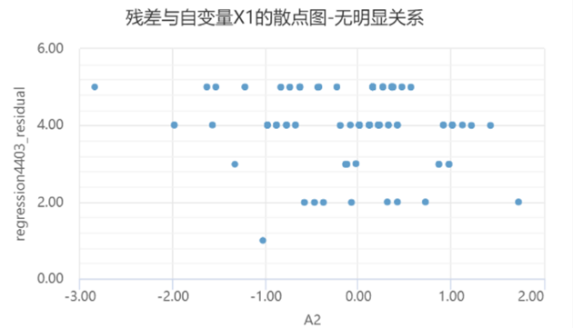 (2) 回归分析后模型检验,查看残差分别与自变量间的关联性【回归模型假定残差不应该与自变量有关联性,即异方差性】。