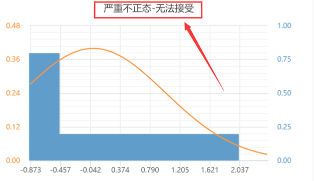 上图可以看出,数据明显偏差正态性,柱子轮廓完全不具有“钟形”即正态性特质,数据完全不符合正态分布。