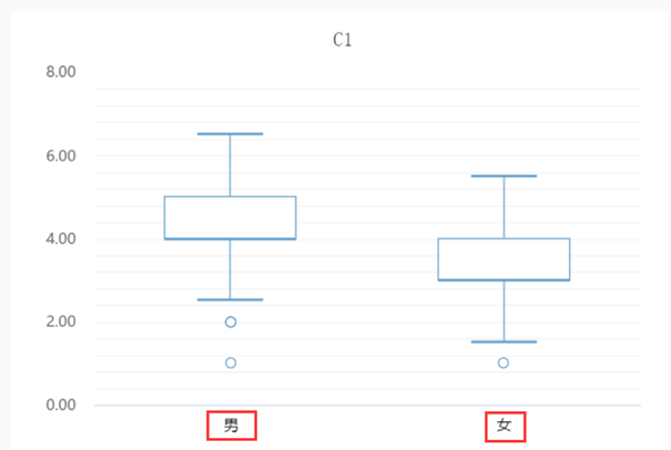 上图可以看出,在男性时,C1中有2个异常点;女性时,C1共出现1个异常点。移动到异常点时会显示具体数据。此时如果有需要,可将此3个异常值进行处理,或者在分析时过滤掉异常值。