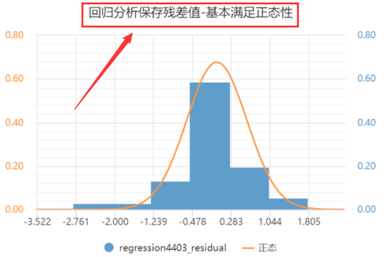 (2) 回归分析后模型检验,将残差进行正态性检验,如果残差呈现出正态性意味着模型构建良好,反之说明模型构建较差。