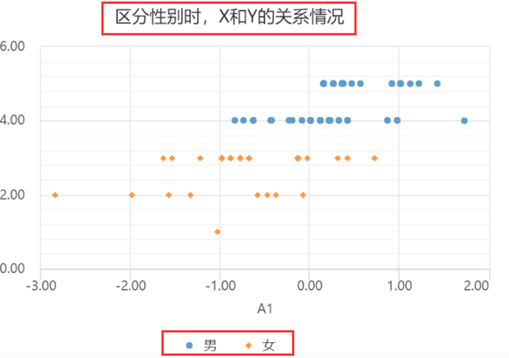 上图区分不同性别群体时,X和Y的散点图。需要让性别放入“颜色区分项”框即可,可直观展示不同类别时,数据间的关系差异情况。