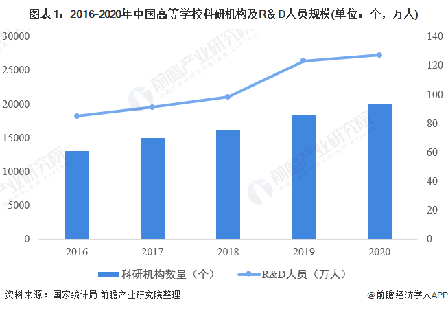 2016-2020年,中国高等学校科研机构及R&D人规模逐年增加。2020年,中国高等学校科研机构数量达到了19988个,相比2019年增加了8.75%;中国高等学校R&D人员数量达到了127.4万人,相比2019年增加了4.1万人。