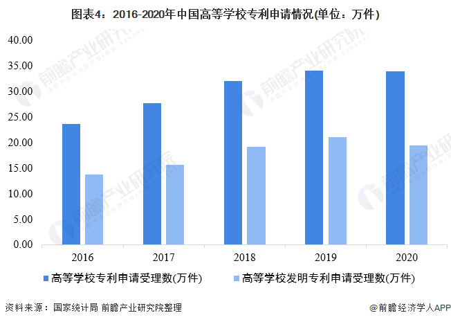 从中国高等学校专利申请数量来看,2016-2020年,中国高等学校专利申请受理数整体保持上升趋势。2020年,中国高等学校专利申请数基本与2019年持平,为34.04万件。其中,发明专利申请受理数为19.46万件,占比57.17%。