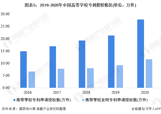 5、高等学校专利授权数增幅较大,发明专利授权占比40%以上