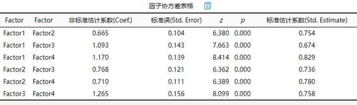 上表格展示因子与因子之间的关联性,可通过标准系数进行分析。从上表可知,在进行因子协方差表格分析时,本研究共4个因子,他们两两之间的标准系数值均介于0.6~0.85之间,说明因子之间具有较强的关联性。