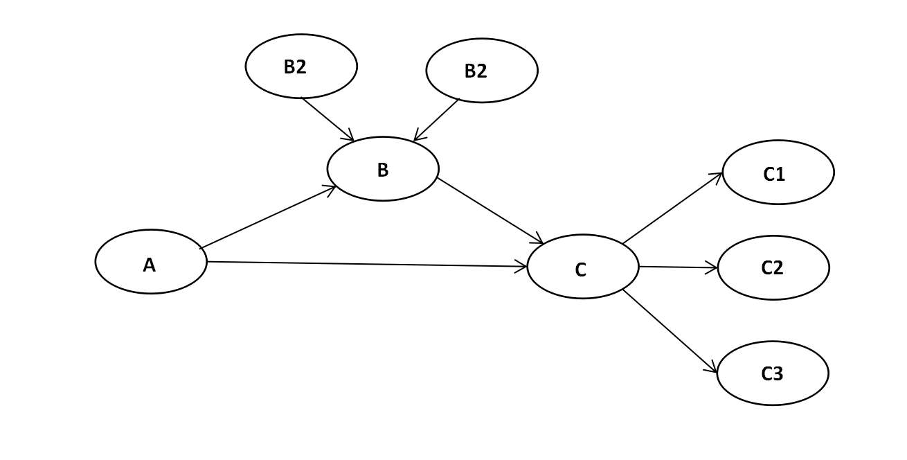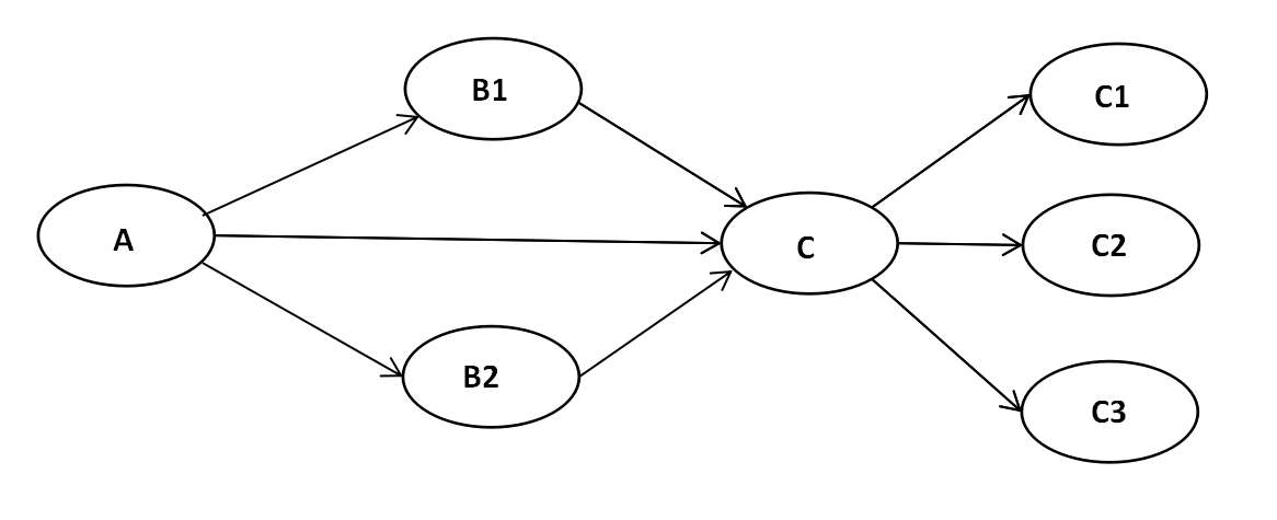 我的模型A→B→C,其中B是形成性指标(B1,B2),C是反映性指标(C1,C2,C3),画出来大概是图1的样子<br>