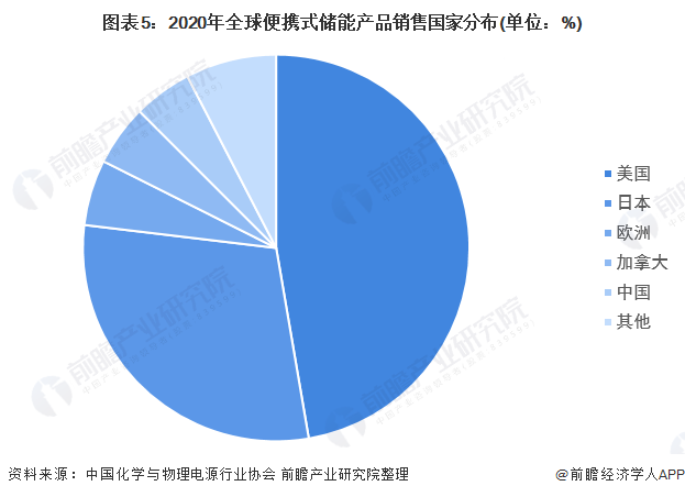美国是便携式储能产品最大的消费市场,2020年,美国便携式储能产品消费量占比达到了47.3%;其次为日本,占比29.6%;欧洲以5.5%的消费占比排名第三。