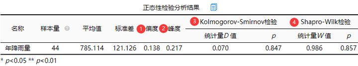 针对年降雨量进行正态性检验,从上表可以看出:研究数据的样本量全部小于等于50,因而使用S-W检验。具体来看,年降雨量全部均没有呈现显著性(p>0.05),意味着接受原假设(原假设:数据正态分布),年降雨量全部均具备正态性特质。