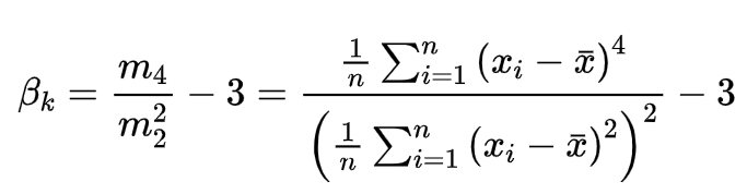 峰度是描述分布尖峭程度和尾部粗细的一个特征数。它的计算公式如下;