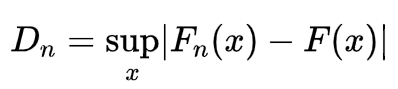 对于一个样本集的累计分布函数Fn(x)和一个假设的理论分布F(x),Kolmogorov–Smirnov 统计量D定义为: