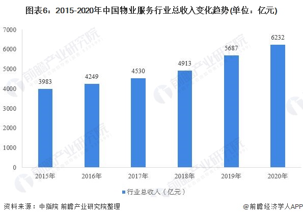 从行业收入情况来看,2015年以来,我国物业管理行业总收入持续提升,截至到2020年末,我国物业管理总收入增长至6232亿元,较上年同期增长9.6%。