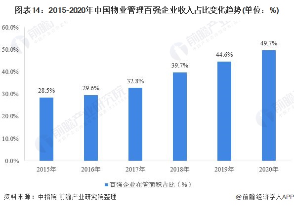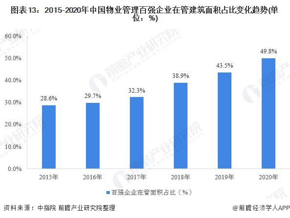 根据中指院发布的物业管理百强企业发展情况来看,2015年以来,我国物业管理百强企业在管建筑面积增长迅速,2020年,我国百强业务管理企业在管建筑面积已较2015年翻倍,增长至129亿平方米。与此同时,百强企业在管建筑占全国物业在管建筑面积的比重持续提升,由2015年的28.6%提升至2020年49.8%。