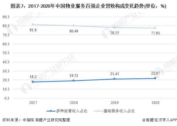按照业务类型的不同,我国物业服务行业营收构成可划分为基础服务收入和多种经营收入,其中基础服务收入仍是物业服务行业主要营业收入来源,但是近年来随着我国物业服务行业多元化发展的推进,以社区增值服务及非业主增值服务所构成的多种经营收入占比持续提升,2017年以来,我国物业服务行业多种经营业务收入占比已由2017年的18.2%提升至2020年的22.07%。