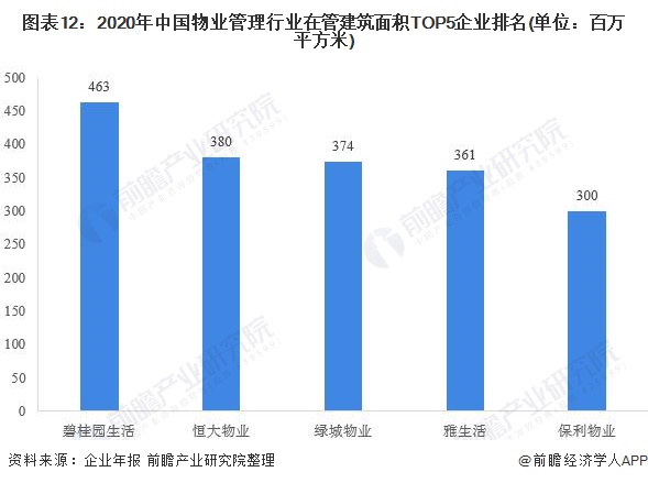 具体到在管建筑面积来看,2020年,我国物业管理在管建筑面积超过3亿平方米的有五家,其中碧桂园生活以4.63亿平方米的在管建筑面积排名第一;恒大物业和绿城物业紧随其后,在管建筑面积分别为3.80亿平方米和3.74亿平方米。