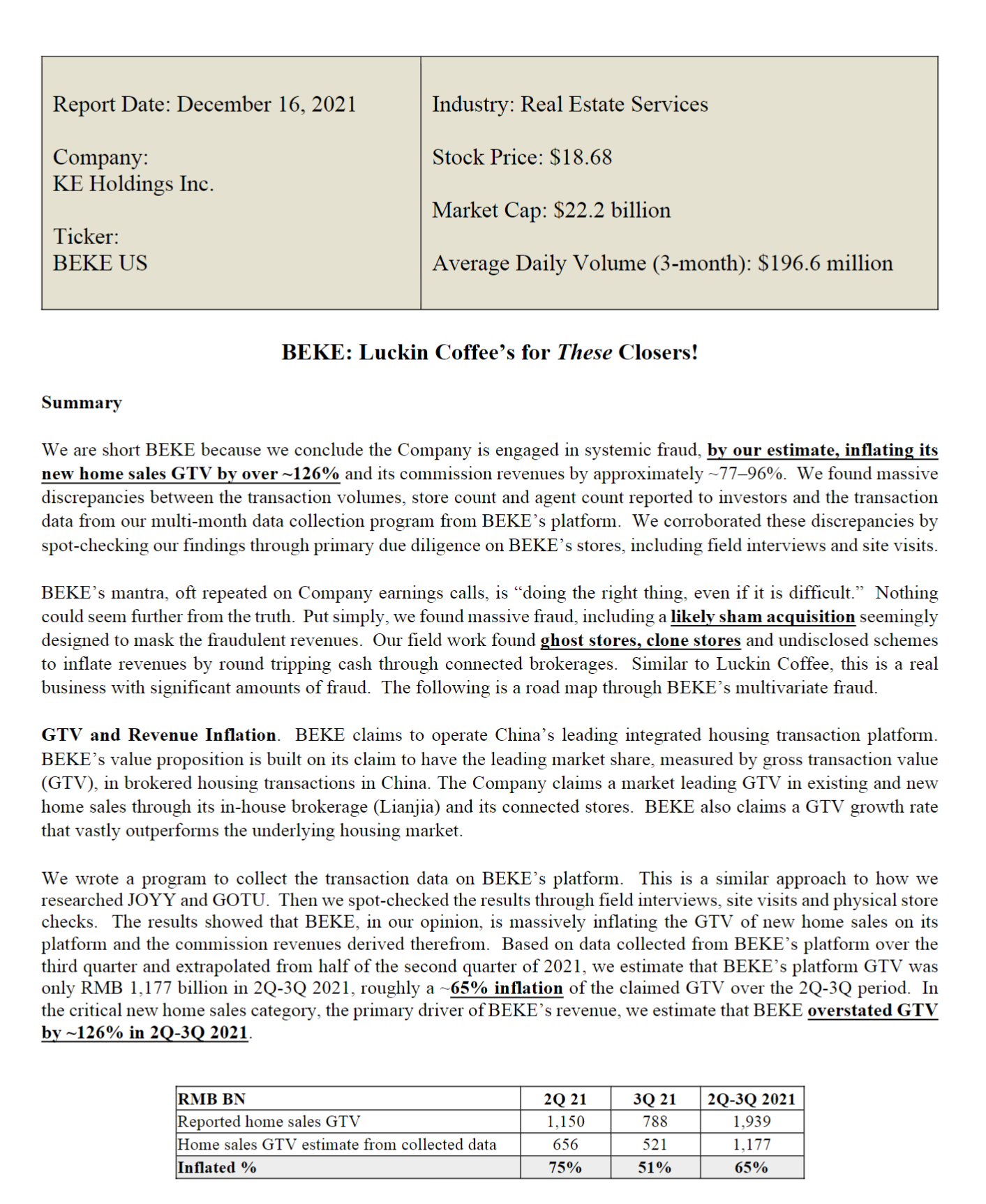 2021年12月16日,浑水发布贝壳77页做空报告,浑水指控贝壳营业收入中大约77-96%都是体外循环资金注水而来;同时指控贝壳Q2末总店数量注水23%。