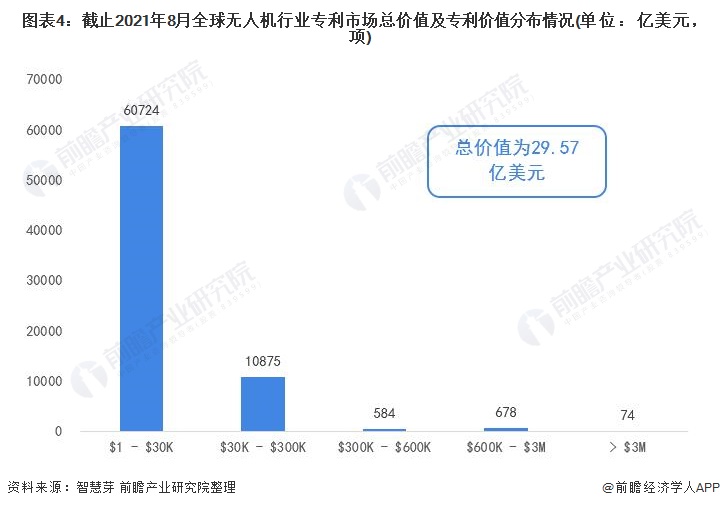 目前,全球无人机行业专利总价值为29.57亿美元。其中,3万美元以下的无人机专利申请数量最多,为6.07万项;其次是3万-30万美元的无人机专利,合计专利申请量为1.09万项。3百万美元以上的无人机专利申请数量最少,为74项。
