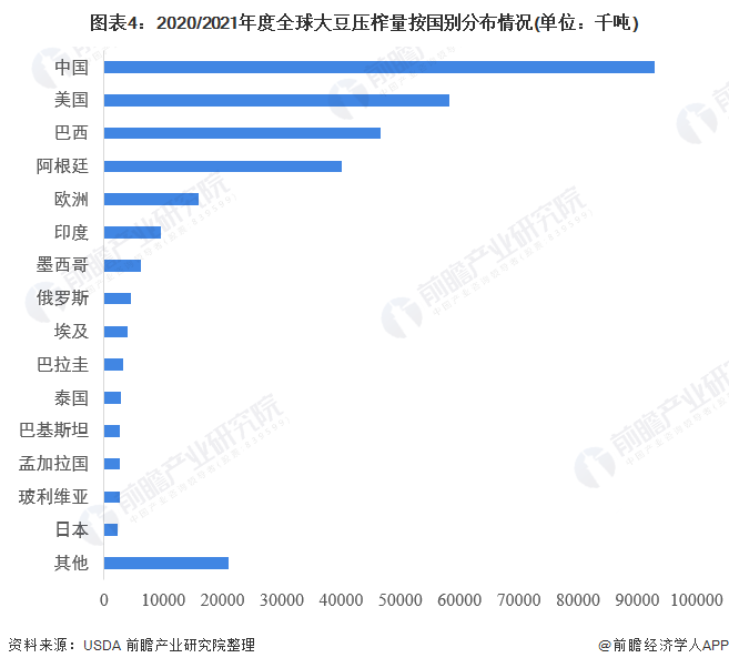 2020/21年度,全球大豆压榨量达到3.16亿吨。中国、美国、巴西分别以93000千吨、58257千吨和46750千吨位列前三。