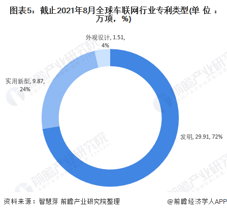 在专利类型方面,目前全球有29.91万项车联网专利为发明专利,占全球车联网专利申请数量最多,为72%。实用新型车联网专利和外观设计型车联网专利数量分别为9.87万项和1.51万项,分别占全球车联网专利申请数量的24%和4%。