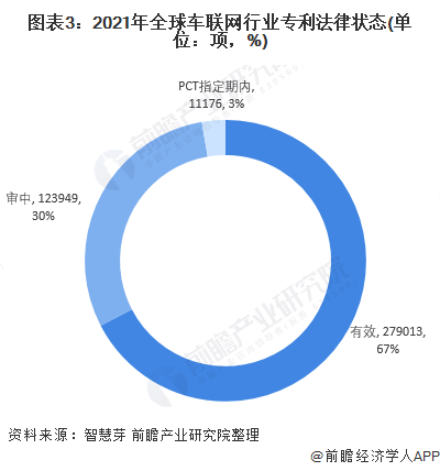 目前,全球车联网大多数专利处于“有效”和“审中”状态,两者车联网专利总量分别为27.9万项和12.39万项,占全球车联网专利总量的67%和30%。PCT制定期内的车联网专利数量为1.12万项,占全球车联网专利总量的3%左右。