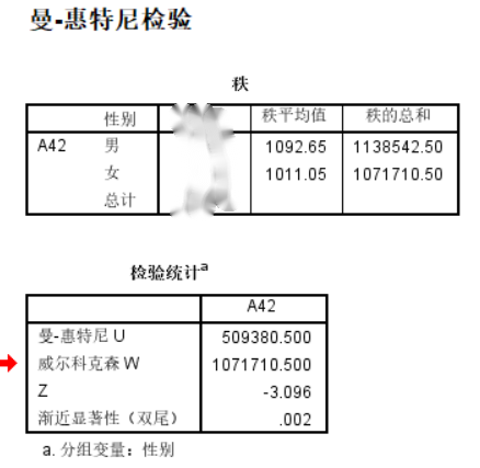 kuangsir6 发表于 2022-1-17 08:54 你为什么把男女的数量栏擦除模糊? 曼-惠特尼U检验是检验数据的秩的平均值是否存在统计学意义上的差别,不 ...
