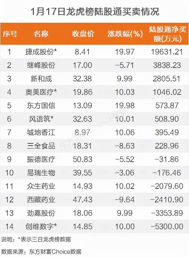 1月17日,上榜龙虎榜个股中,资金净流入最多的是捷成股份,三日净流入2.54亿元。数据显示,该股日内20CM大号涨停,近三日累涨46.01%。资金净流入居前的深股通席位三日净买入1.96亿元。