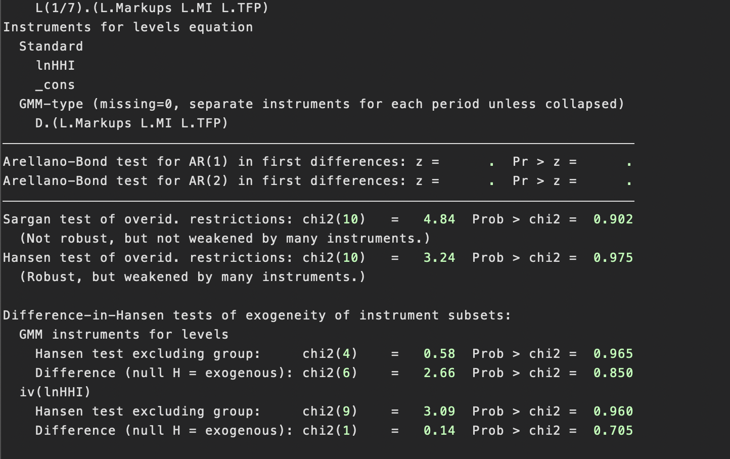 最后,请注意,即使AR(1)和AR(2)测试通过,也并不保证您的模型没有其他问题(如过度识别、弱工具变量等)。进行详细的敏感性分析总是好的实践。