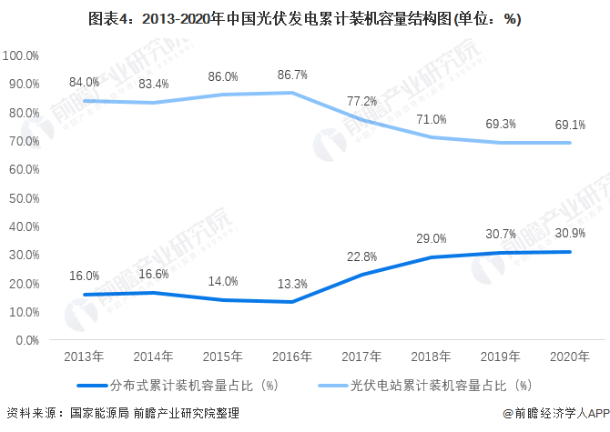 据国家能源局统计数据显示,2013年以来,我国分布式光伏发电市场份额稳步提升,2013年,分布式光伏发电累计装机容量占总体的16.0%,到2018年,增长至占总体的29%。2019年市场份额进一步提升,分布式光伏发电累计装机容量占总体比重上升至30.7%;截至2020年底,全国分布式光伏装机7831万千瓦,占光伏总装机比重30.9%,高于全球均值近10个百分点,且此项占比将继续上升。