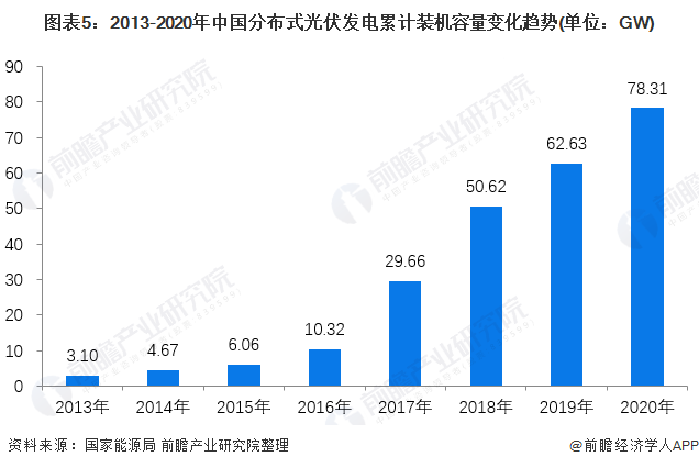 市场份额逐步提升的同时,我国分布式光伏发电累计装机容量也在快速提升,据国家能源局统计数据显示,2013年,全国分布式光伏发电累计装机容量仅为3.1GW,到2019年,我国分布式光伏发电累计装机容量已达到62.63GW,较2013年增长近20倍;2020年,我国分布式光伏发电累计装机容量达到78.31GW。
