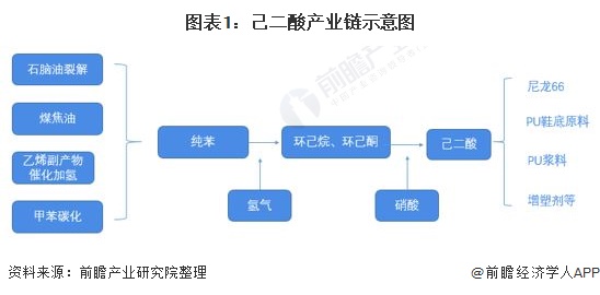 己二酸是一种重要的有机二元酸,目前主流的制备工艺是环己醇的硝酸氧化法,一般以苯为起始原料,将苯催化加氢转化成环己烷,再利用硝酸氧化得到己二酸。它可以与二元胺缩聚成高分子聚合物,其下游主要应用于PU浆料和鞋底原液等。