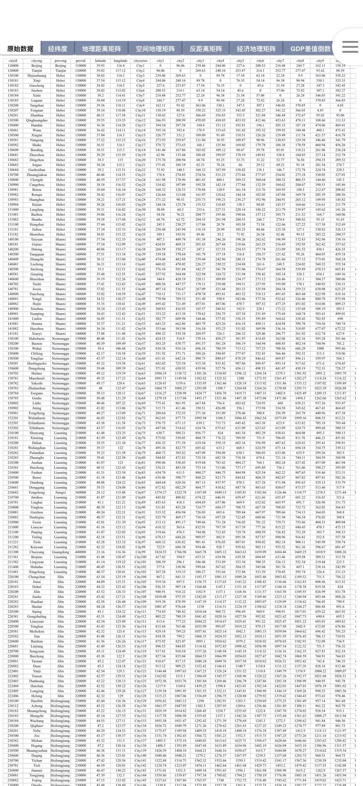 城市空间权重矩阵包括:原始数据、地理距离矩阵、空间地理矩阵、反距离矩阵、经济地理矩阵、GDP差值倒数、地理矩阵标准化、反距离矩阵标准化、经济地理矩阵标准化