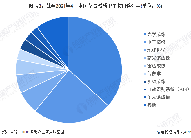 截至2021年4月,在遥感卫星各用途方面,光学成像卫星为79颗,占遥感卫星总量的36.74%;其次为电子情报,存量卫星数量为52颗,占比24.19%;第三位为地球科学,卫星数为为15颗,占比6.98%;其他应用占比相对较少。