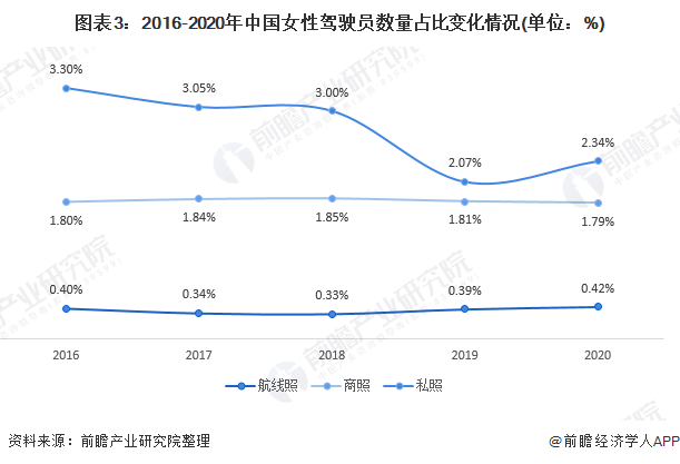 从女性驾驶员数量占比上看,我国民航女性驾驶员数量占比较小。2020年,我国航线照、商照、私照女性驾驶员数量占比分别为0.42%、1.79%、2.34%。