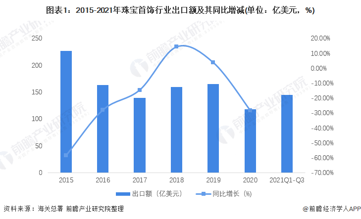 2015-2019年我国珠宝首饰行业出口额呈先下降后上升趋势,2019年达165.29亿美元。2020年疫情影响下,中国珠宝首饰行业出口额为118.34亿美元,同比下降28.40%。随着疫情逐渐得到控制,中国珠宝首饰行业出口额恢复上升,2021年前三季度达144.49亿美元。