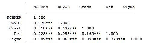 二是采用收益率上下波动比率(DUVOL)度量股价崩盘风险。 对于每个公司、季度,首先定义特质收益率小于均值的日为下跌日,特质收益率高于均值的日为上涨日。然后分别计算出下跌日和上涨日特质收益率的标准差,得出下跌波动率和上涨波动率。 最后,以下跌波动率除以上涨波动率并取自然对数,即得到每一个公司、季度样本的 DUVOL 指标。 计算公式如下: