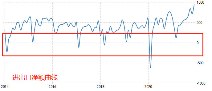图中周期性下探的曲线结构,就是每年第一季度的三个月的数据。2014年、2017年、2018年和2020年的进出口净额甚至跌幅负值区间,也就是贸易逆差。既然扩张的贸易顺差能够刺激人民币出现升值走势,那么收缩的贸易逆差就有能力推动人民币出现与升值相对的BZ走势。现在是1月24日,二月份和三月份的进出口净额出现周期性下降,预计USDCNH出现上涨走势的可能性较大。