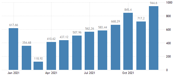 2021年12月,中国贸易顺差从上年同期的758亿美元大幅扩大至944.6亿美元,创历史新高,轻松超过市场预期的745亿美元。注意,进出口差额创出的是历史新高,而不是某几年的新高。背后的原因当然是国外疫情依旧严重,没有实现国内一般的“动态清零”。能够开足马力生产的国家只有中国,海外订单源源不断的涌入,自然会导致贸易顺差的扩大。联系前文所述的贸易商以额外美元兑换人民币,可以得出结论,贸易顺差对离岸人民币升值具有显著推动作用。需要提醒的是,每年的第一季度(1~3月份)都是进出口净额的低谷期(如下图)。