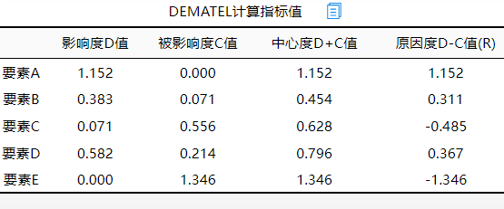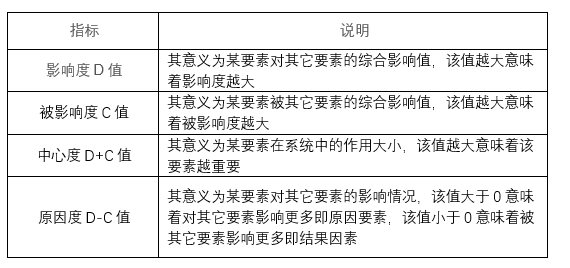 Dematel其是一种运用图论和矩阵工具解释问题的系统分析方法。其通过系统中各要素之间的逻辑关系和直接影响矩阵,可以计算出每个要素对其它要素的影响度以及被影响度,从而计算出每个要素的原因度与中心度,作为构造模型的依据,从而确定要素间的因果关系和每个要素在系统中的地位。