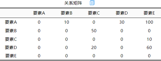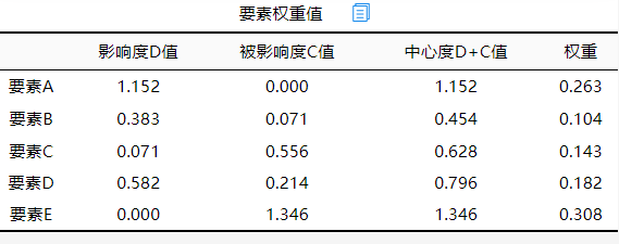 上表格展示出各要素的权重值,中心度D+C值:其意义为某要素在系统中的作用大小,该值越大意味着该要素越重要;那么针对‘中心度D+C值’进行归一化处理后,即得到各要素的权重值。