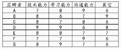 比如有A,B,C,D,E,F,G共7名备选应聘者,共对应聘者四种能力进行打分,最低为1分,最高为10分,分值越高能力越强。现希望结合四种能力(即四种指标)对应聘者综合能力进行评估排序,最终找出适合的应聘者。