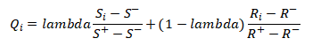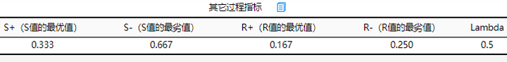 上表格展示中间过程值,S+,S-,R+和R-值,其分别代表‘VIKOR分析结果汇总’表格中S值的最大或最小值,也或者R值的最大或最小值。其也用于计算最终的利益比率Q值。除此之外还列出lambda值(决策机制系数),SPSSAU默认是0.5。