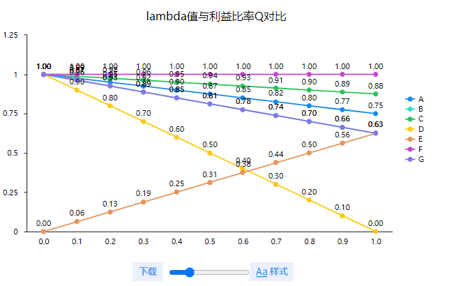 从下图可以看出,除开E外,另外5名应聘者,随着lambda值越大(即越风险偏好时),Q值会越来越小即相对‘越优秀’。但E这位应聘者,随机越风险偏好时,Q值会越来越大,说明如果越风险偏好时反而越可能不应该选择E这位应聘者(可能E这位应聘者各项能力相对更平稳,但是E的综合实力相对较强,因而无论如何均会选择E)。