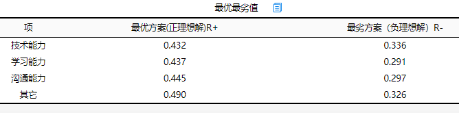 上表格中展示出各评价指标(案例为四种能力)的最优方案R+或最劣方案R-;