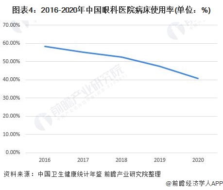 2016-2020年,我国眼科医院病床使用率整体呈下降趋势。2016-2019年,病床使用率由58.40%下降至47.38%,整体来看,眼科医院病床使用率偏低。2020年,眼科医院病床使用率为40.73%。