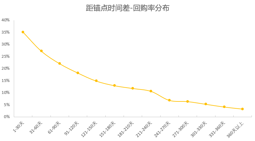最近一次购买时间距离锚点30天以内的用户,在锚点之后的时间范围,回购概率高达35%。最后一次购买时间越远,其后回购的可能性也越低。