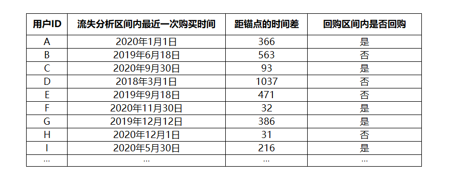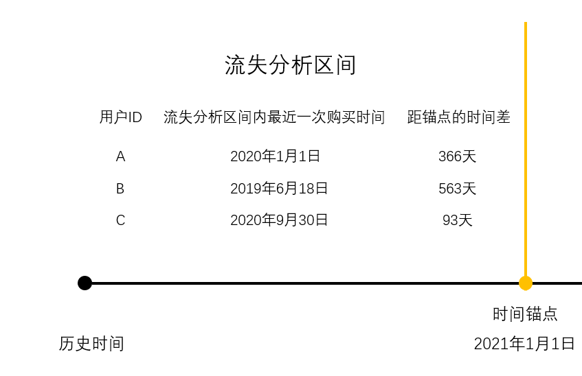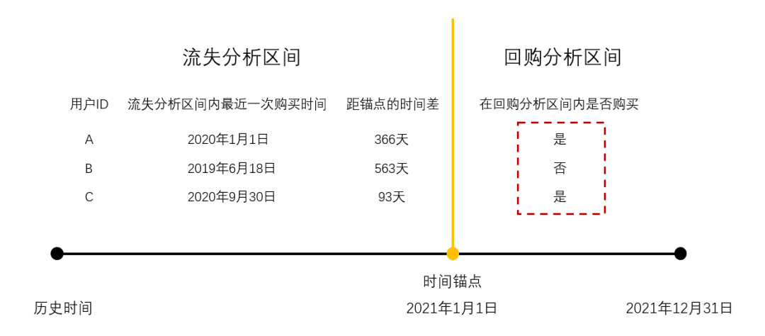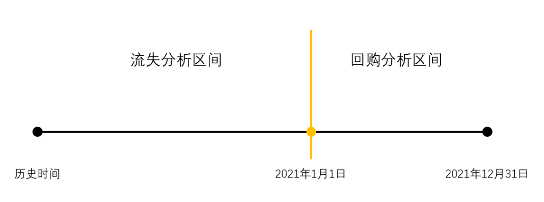 比如2021年1月1日。以此时间点为分界锚点,确定流失分析的时间区间和回购分析的时间区间。